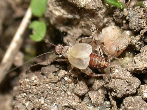 お散歩コースの途中には、お年寄り達が谷あいを勝手に開墾して畑をつくっているところがある。 こういう日当たりのよい、土が見えているようなところに多いのがコレ、 マダラスズDianemobius nigrofasciatus すぐにピンピン跳ねて逃げていくので、写真を撮れ…