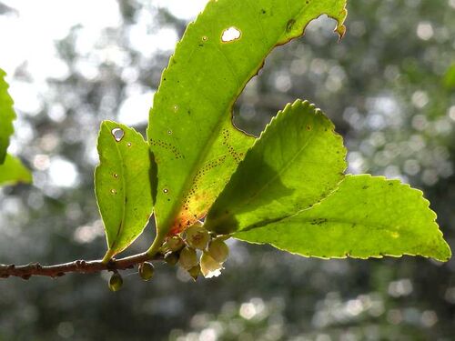 月曜の今日は、花冷えと言うには度を越した寒さである。 昨日の日曜日は、まだましであった。 その日曜日のお散歩コース。 ヒサカキの花を見上げながら歩いていると、ふと目に留まった葉っぱ。 規則的なキズ。 ナンジャロ? と引き寄せて見たが、よく判らな…