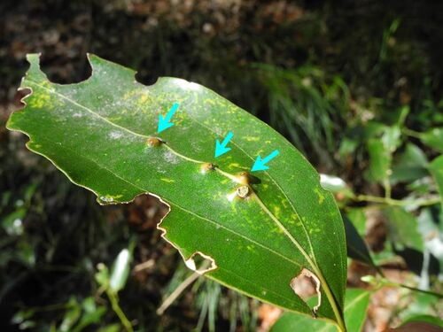 冬なので生きた虫になかなか会わない。 でもまあ、いろいろ探してみる。 谷筋に生えた背丈ほどのヤブニッケイ。 葉っぱがなんだか変。 ニッケイトガリキジラミの虫コブだ。 普通は裏側の窪みにキジラミの幼虫がはまりこんでいるはず。 裏返してみると、、、 …