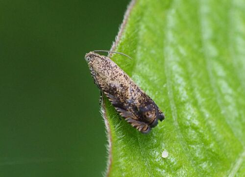 梅雨の晴れ間の日曜日、というわけにはいかず、 梅雨らしい天気の日曜日。 家でジッとしていれる性分ではないのでお散歩に出る。 ササキリの赤ちゃんでも見れたらイイや、と思ったがハズレ。 地味なヒメハマキがいたので確保。 前翅前縁にギザギザ模様がある…